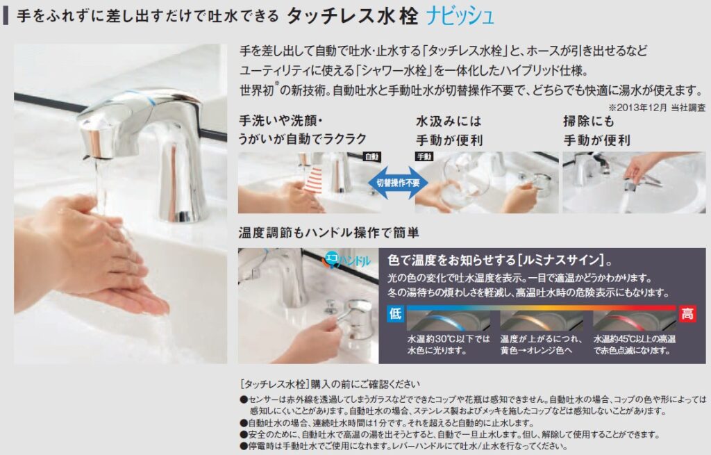 ルミシスに標準装備可能な「ナビッシュ タッチレス水栓」は、手をかざすだけで吐水・止水できる先進的な機能を備えています。メイク中で手に化粧品がついている時や、歯磨き粉で手が汚れている時でも、水栓本体に触れずに水を使えるため、常に清潔な状態を保てます。